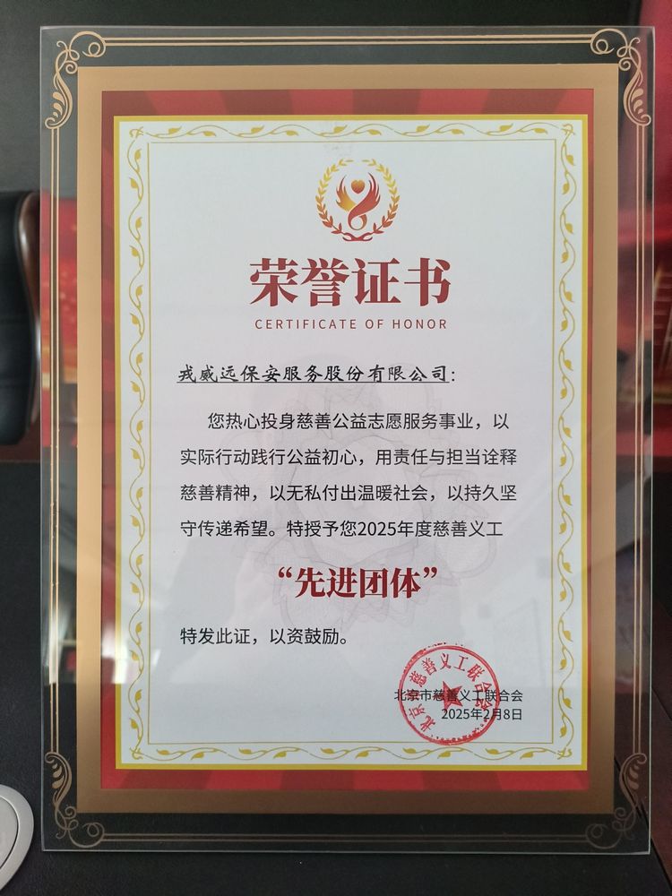 长期以来,戎威远保安公司始终坚持党建引领,积极投身公益慈善事业,持续践行社会责任,用心打造社会认可的“好人公司”,以爱心传递正能量,以担当回馈社会。2025年,戎威远保安服务股份有限公司荣获“2025年度北京慈善义工”先进团体。未来,公司将继续深耕慈善事业,把温暖与关怀送到更多需要的地方,为慈善事业与社会发展贡献力量。