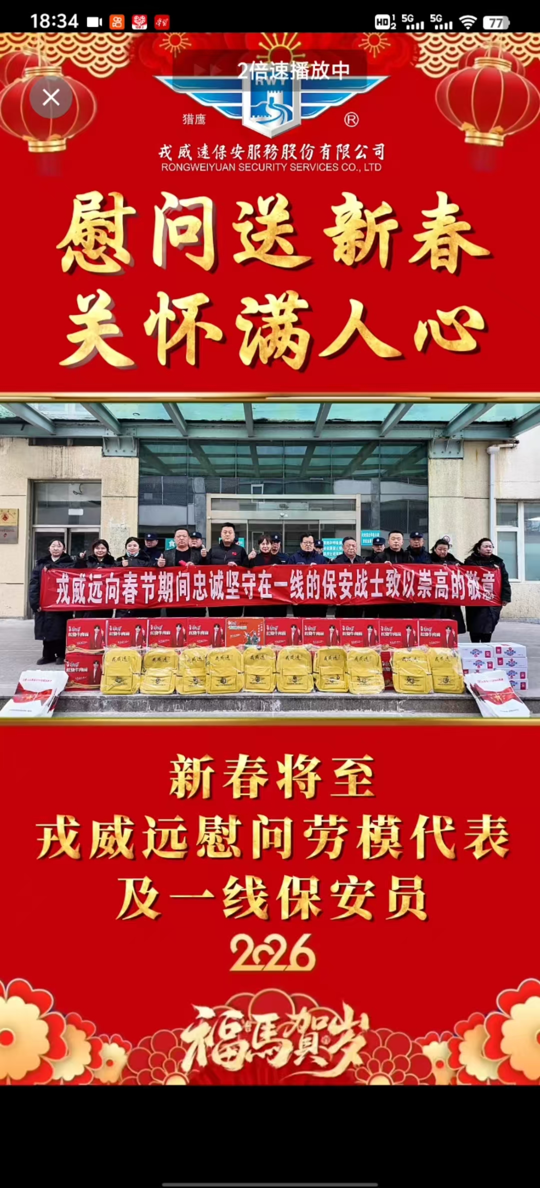2026年新春佳节来临之际,北京戎威远保安服务有限公司开展"新春送温暖"慰问活动,公司领导班子深入基层一线,向坚守岗位的劳模代表及一线保安员送上节日祝福与暖心关怀,以实际行动诠释企业责任担当,为首都春节安全保障工作注入温暖力量。